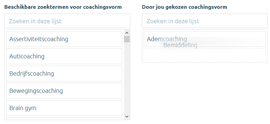 Wanneer de bezoeker zoekt op een bepaalde klacht of massagevorm (vb. buikmassage), wordt jouw profiel enkel getoond wanneer jij die klacht of massagevorm ook geselecteerd hebt in je profiel bij de 'Zoektermen'. Zoekt iemand naar ondersteuning bij lage rugpijn, dan verschijn jij enkel in de zoekresultaten indien je de term 'Lage rugpijn' hebt geselecteerd.